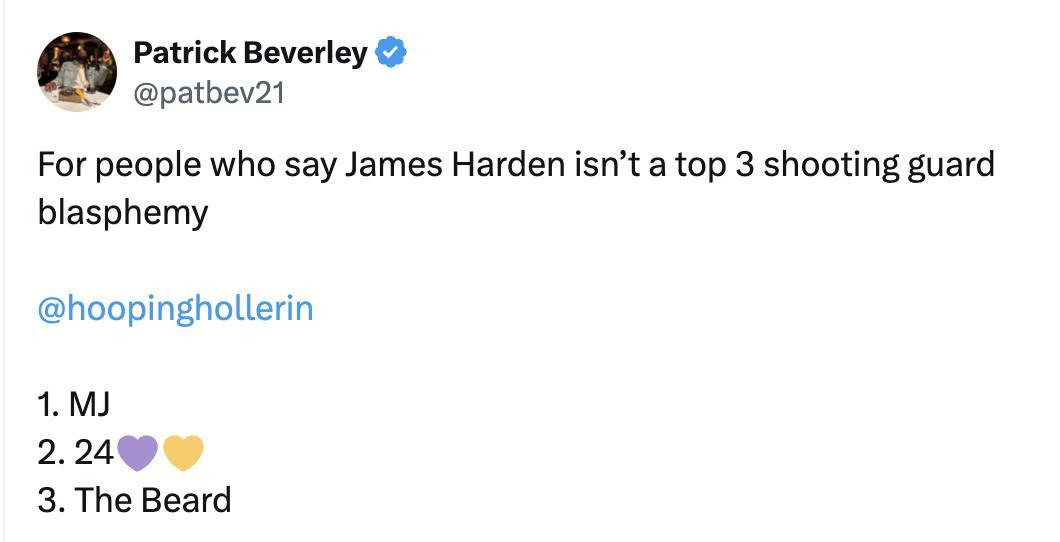 贝弗利写道:“那些说哈登不是联盟前三得分后卫的人简直是亵渎神明。”
